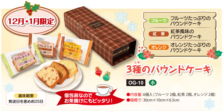 【オレンジ】小麦粉(国内製造)、マーガリン(乳成分・大豆を含む)、砂糖、鶏卵、オレンジピール、リキュール、澱粉分解物/ベーキングパウダー、香料