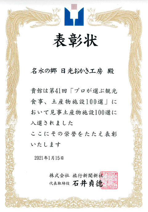 旅行新聞社、「第41回プロが選ぶ観光食事、土産施設100選」に入選しました。